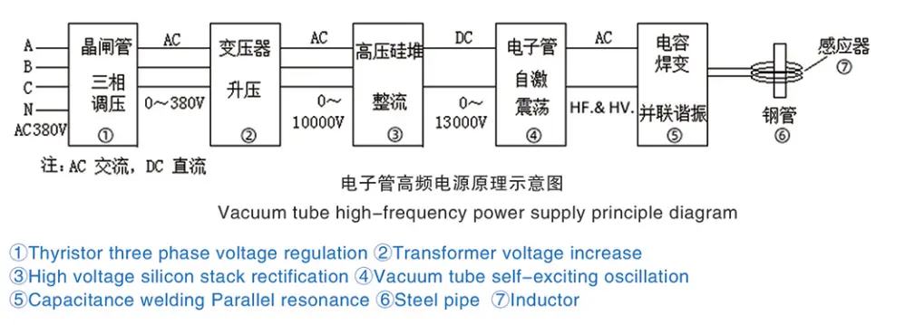 Normale industriële WS (driefase vier drade 380V/50HZ in China) word omgeskakel in verstelbare WS wat wissel van 0 tot 380V (frekwensie onveranderd) deur tiristor WS spanningsreguleerder, en dan verhoog tot byna 10000V hoë spanning (frekwensie onveranderd) deur 'n hoë spanning gelykrigte transformator, en dan verhoogde spanning GS, en dan geossilleer deur vakuumbuis na HF en HV stroom, en dan deur LC parallelle resonansie om ossillerende stroom te versterk, en na spanningsvermindering toevoer na induktor wat gebruik word vir verhitting van staalpype en ander werkstukke, ens.
